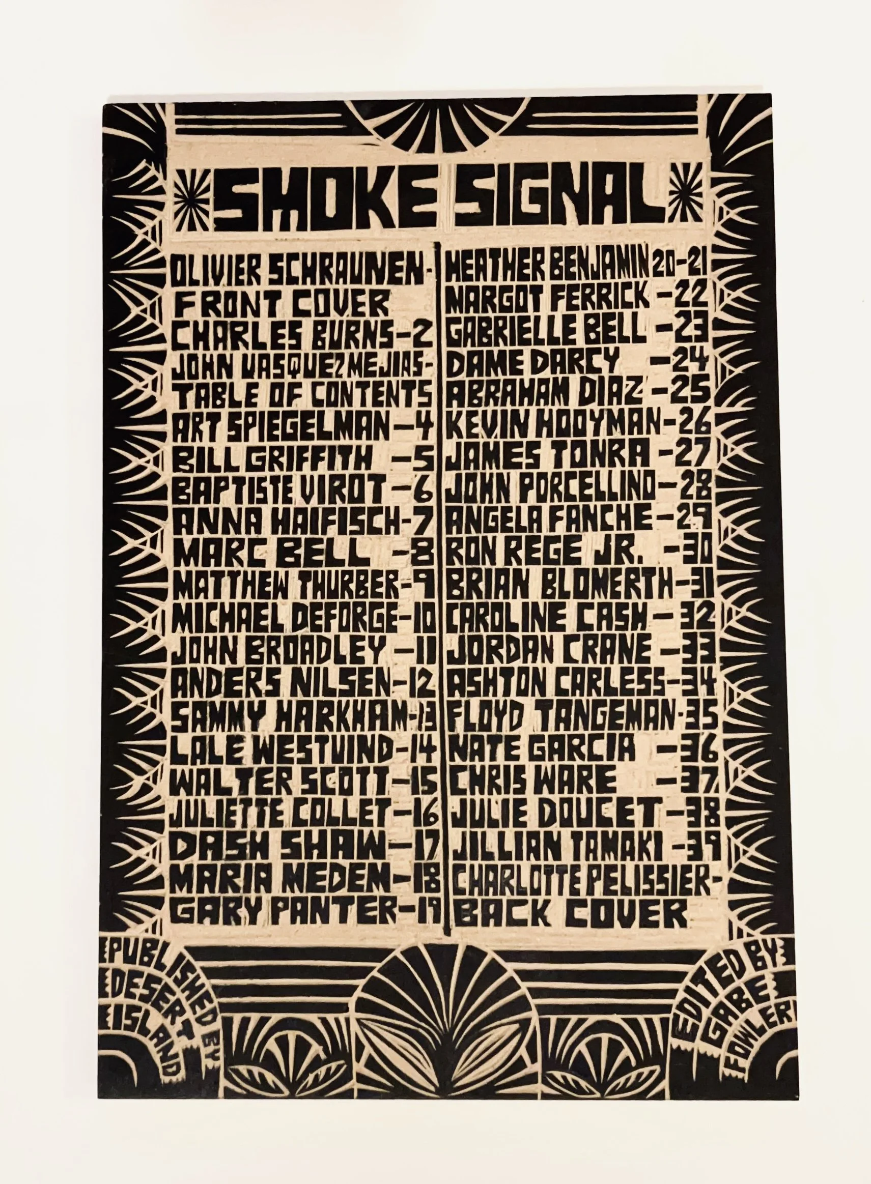 Table of contents page for Smoke Signals published by Desert Island. 11 1/2” x 17”